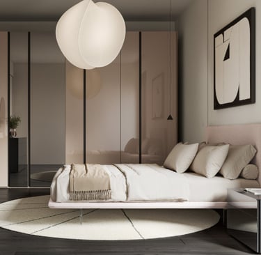Une chambre qui combine les laques Sable et Noir avec des matériaux comme le verre et le miroir. Pour un effet chic qui met également en valeur la fonctionnalité.