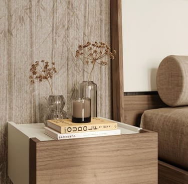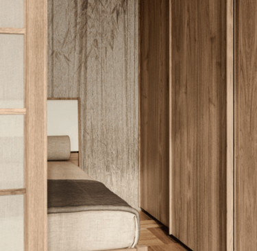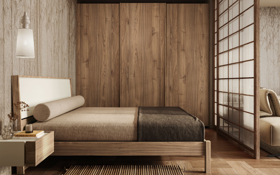 Dans cette pièce, le noyer blond est le protagoniste avec tout son charme et son effet chaleureux et accueillant qui décore toute la pièce, de l'armoire aux tables de chevet.