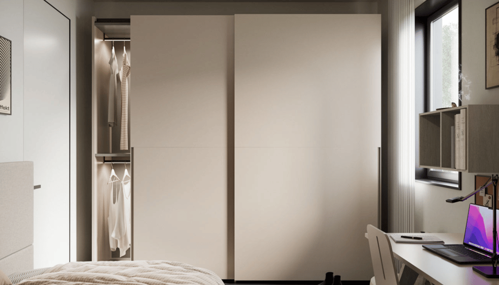 Tout d’abord parce que c’est le même style moderne qui prête attention à la fonctionnalité et à la bonne organisation des espaces, si importante dans une chambre qui, comme nous le savons, n’est souvent pas de grande taille. Deuxièmement, parce que même les couleurs et les solutions choisies respectent pleinement le style moderne.