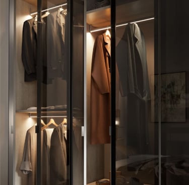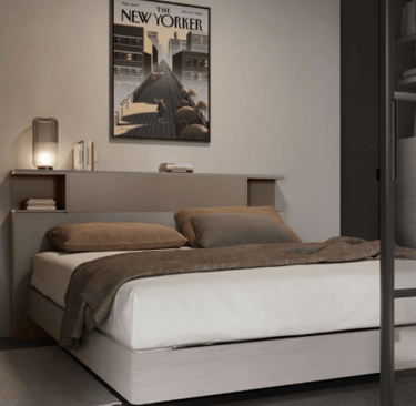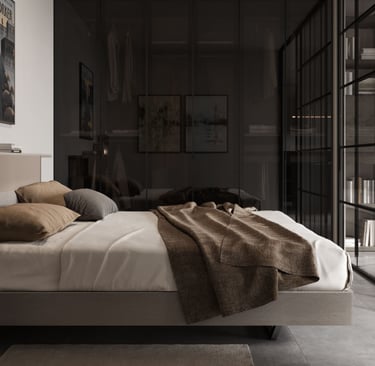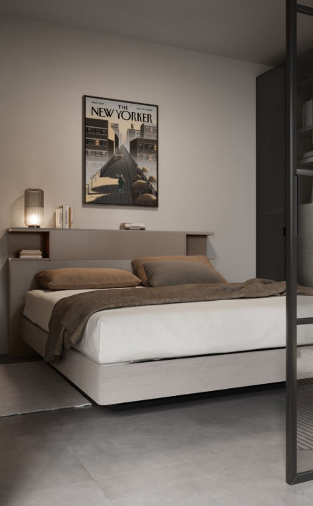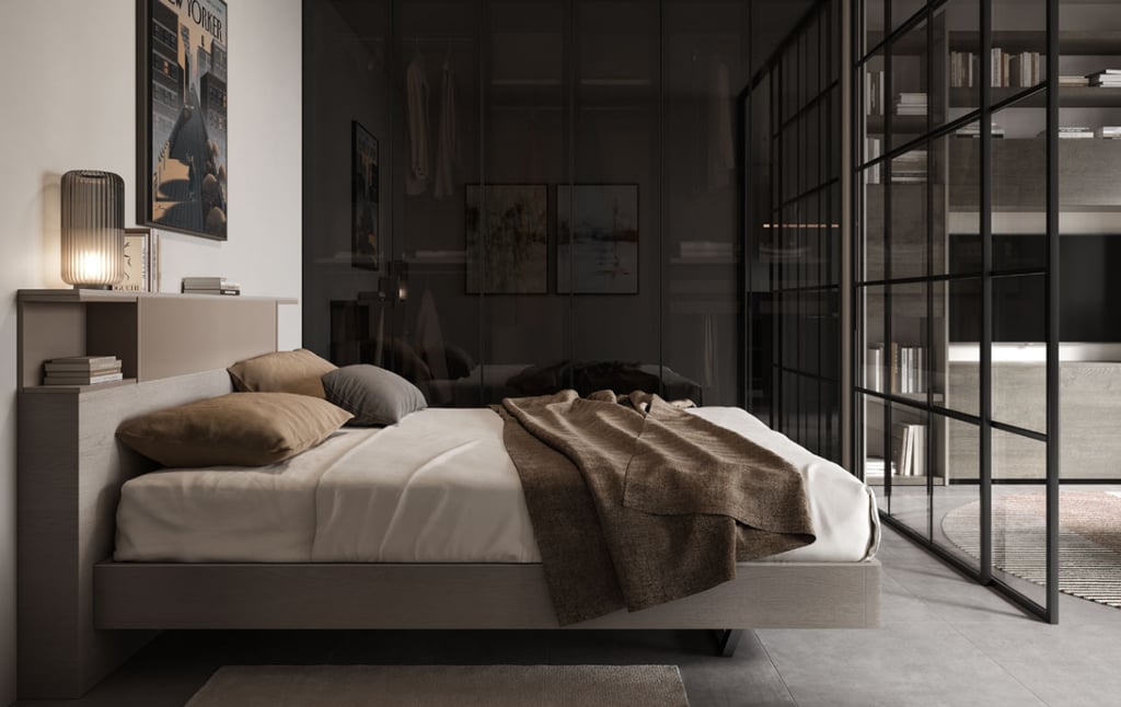 Le lit français et les portes d'armoire fumées confèrent à cette pièce la fonctionnalité et le courage nécessaires. Pour avoir tous vos vêtements en ordre, grâce également au lit coffre, et surtout bien vous reposer.
