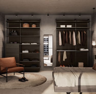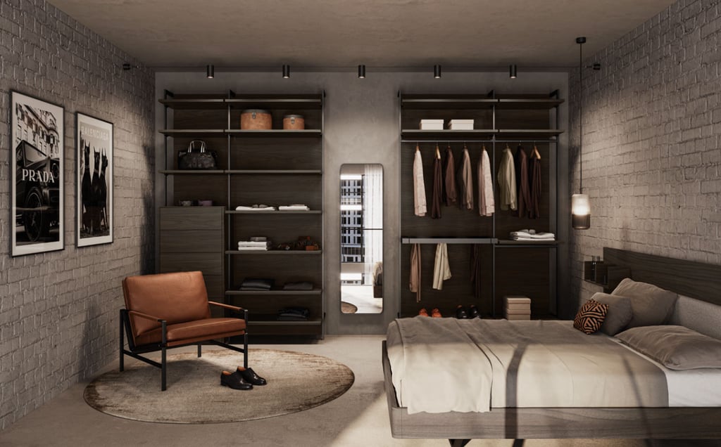 La combinaison du stratifié effet bois noyer foncé avec les poteaux en métal noir, qui composent la structure de l'armoire, crée un effet totalement urbain chic.