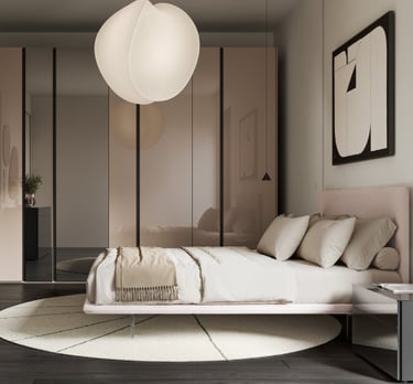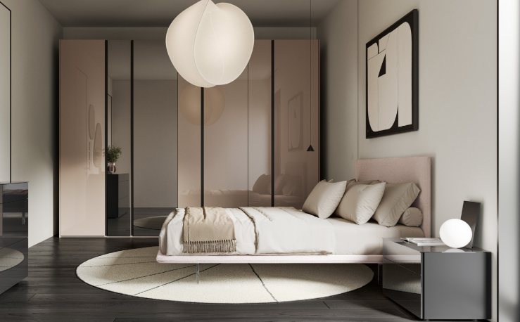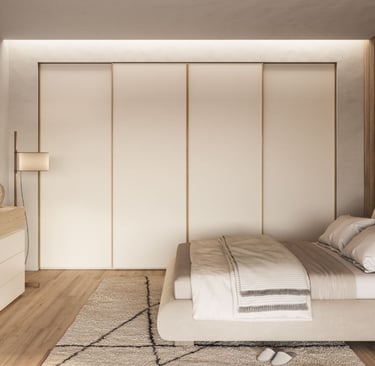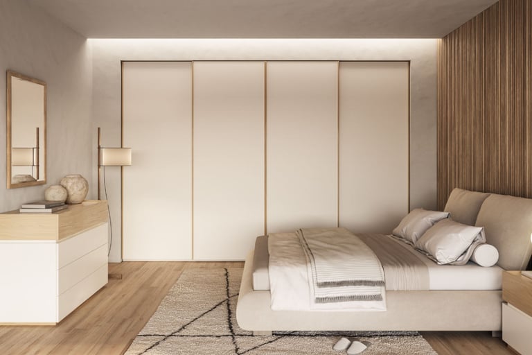 Un ensemble de trois matériaux et finitions définit la chambre qui occupe la mezzanine. Le tissu pour le lit, les laques et l'effet bois pour l'armoire et la chambre à coucher étaient la combinaison parfaite pour créer un environnement en complète harmonie chromatique, idéal pour une bonne détente.