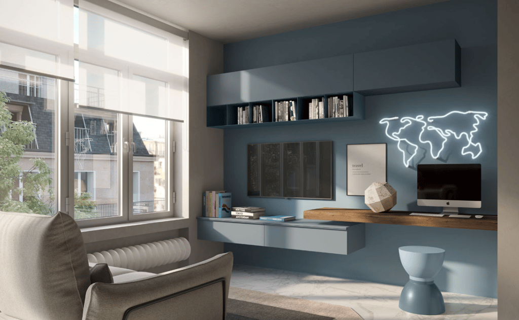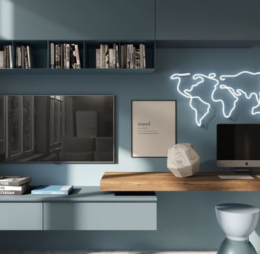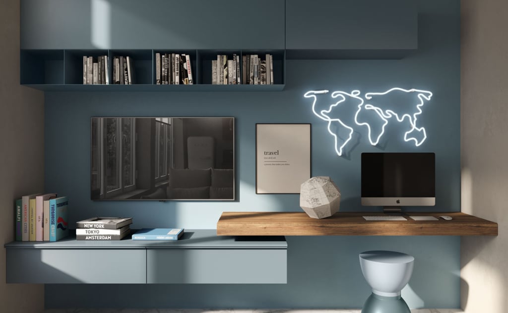 Deux utilisations et deux couleurs qui rappellent le ciel et la mer et deux espaces : un pour se détendre et un pour travailler. D'une part le bureau à domicile ; de l'autre, la télévision, les bibliothèques, les éléments hauts, les commodes et le canapé Nuvola pour rêver de nouvelles destinations.