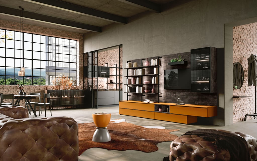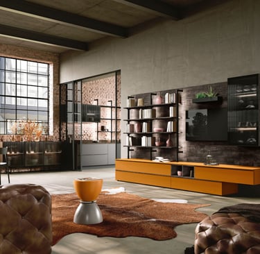 Audacieuse et intemporelle, l'approche stylistique de l'ameublement de ce salon trouve sa force expressive dans la combinaison de matériaux et de finitions qui créent un agréable jeu de contrastes. La laque Kaki des plinthes murales se marie parfaitement avec les nuances sombres du bois brûlé et le verre ondulé des portes de la vitrine et du buffet, soulignant le caractère urbain de l'environnement.